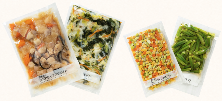 高齢者のために全国多数の有力メーカーとパートナーシップを組み、高齢者のために共同開発したプライベートブランド商品の食材を中心に、各施設様へお届けする完全調理済み冷凍食材供給サービスです。