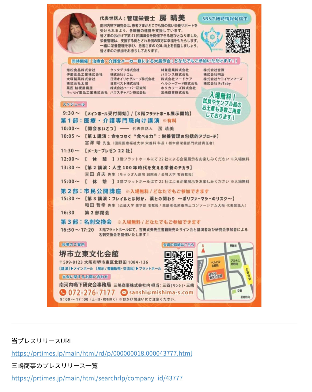 堺市と締結した「災害時における介護食の供給に関する協定書」に基づき、高齢者・要介護者の「食」を守る備えを広めています。