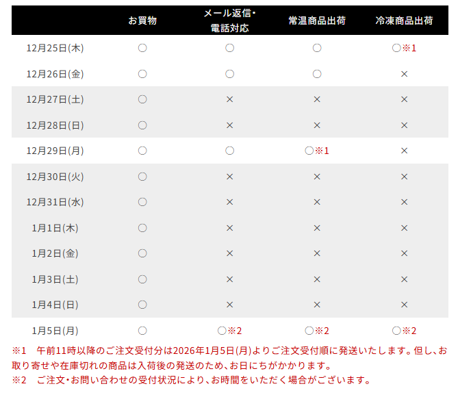 誠に勝手ながら、休業前発送をご希望の場合は12月12日(金)午前11時までにご注文いただきますようお願い申し上げます。